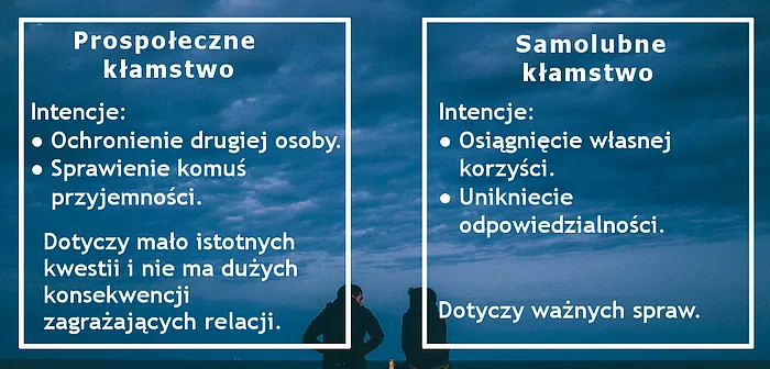 Okazuje się, że większość z nas wskazuje uczciwość jako jedną z podstawowych wartości. Badania pokazują jednak, że kłamiemy kilka razy dziennie. Skąd ta sprzeczność? Psychologowie społeczni twierdzą, że kłamstwo kłamstwu nierówne, a mówienie nieprawdy w wielu przypadkach wynika z dobrych intencji. Dorośli kłamią regularnie, szczególnie w relacjach z bliskimi. Kłamstwa te mają szczególną, społecznie pożyteczną funkcję: mogą poprawić nastrój osoby okłamanej, zmotywować do działań, wzbudzić zaufanie i przybliżyć kłamiącego i okłamywanego do siebie. Przykładem mogą być rodzice okłamujący dzieci, aby wzbudzić w nich pozytywne emocje i dowartościować (np. „Jaki piękny rysunek!”).